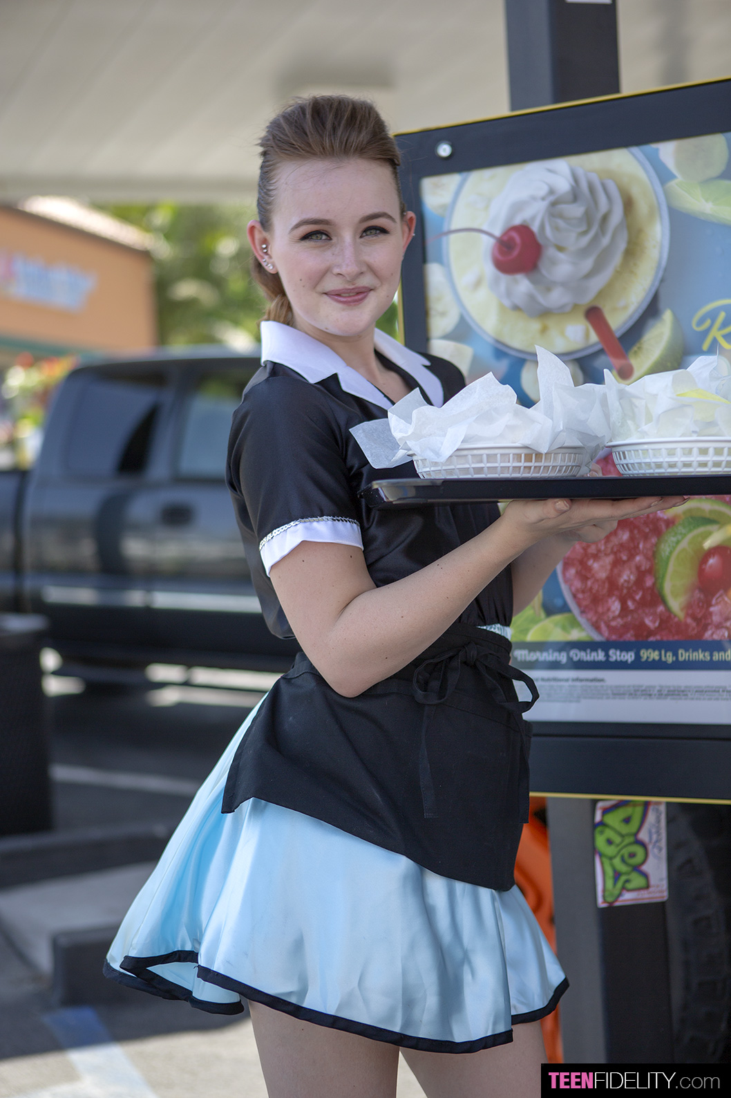 Smokin hot Danni Rivers has all the boys in town in a tizzy and if they only knew her Secret Menu existed they’d be creaming their jeans trying to head to the retro fast food joint where she works! Danni earns extra cash by giving up that tight horny little pussy of hers to her most generous customers, and Ryan here is willing to fork over a big fistful of cash to fuck her tight teen hole…and in this Teen Fidelity update called Fast Food Girl we get to see it all go down! She looks hot as hell in her waitress uniform but even hotter getting her legs spread open to get fucked like there’s no tomorrow by that big horny cock of his, and Danni just holds on for dear life as she gets her pussy pounded and ends up with a creampie load of cum inside to remember him by!